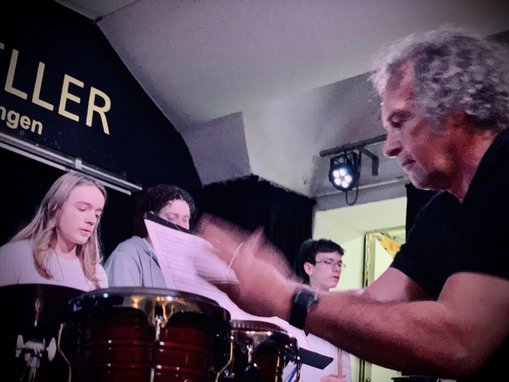 Den Auftakt bestritten Formationen des neuen BandRoom-Angebots unter der Leitung von Jürgen Ott und Kevin Dorst, die mit Titeln wie „What Are You Waiting For“ von Nickelback ihre Spielfreude überzeugend unter Beweis stellten. Für besondere musikalische Akzente sorgten Noah Heizmann und Lukas Kälble mit „Virtual Insanity“ von Jamiroquai sowie das Gitarrenensemble mit den Stücken „Wir ziehen in den Frieden“ und „Moonlight Shadow“. Das Percussionensemble begeisterte das Publikum mit „Latin Brothers“ von Markus Lonardoni unter der Leitung von Martin Herrmann.